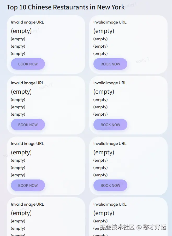 测试一下稳定性,修改一下提问Top 10 Chinese restaurants in New York,发现返回的UI里面都没有图片等信息了,全部是空占位符,说明当前的A2UI工程包括大模型直接生成A2UI JSON,并非那么稳定可靠。