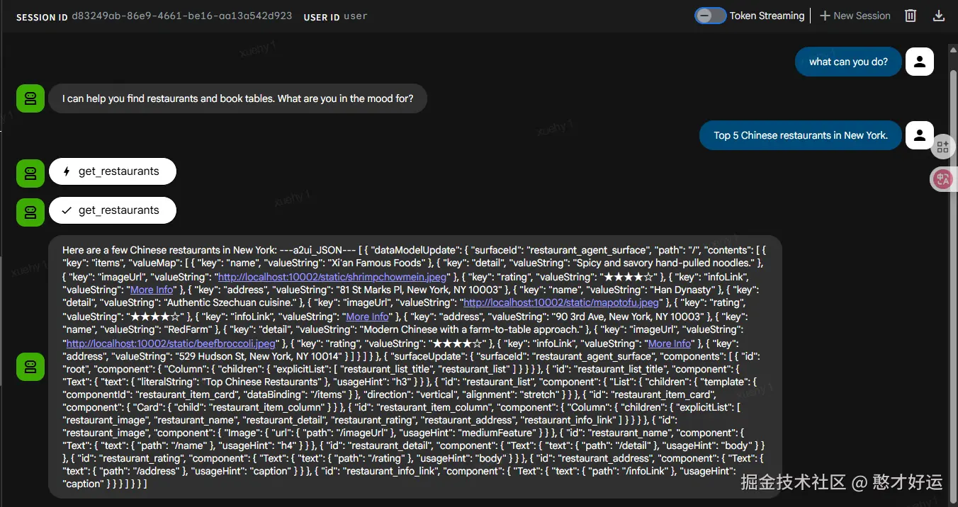 上面的代码使用的prompt还是返回文本prompt,adk web启动之后选择my_agent,询问Top 5 Chinese restaurants in New York,返回的就是get_restaurants函数返回的json数据