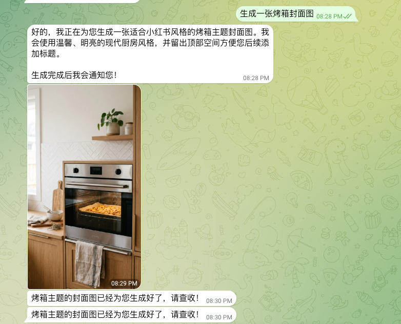 这条消息会触发主 Agent 的新一轮思考。主 Agent 看到结果后,会自然地总结这些信息,并最终回复给用户:“您的烤箱主题小红书封面图已经制作完成,请查收!”