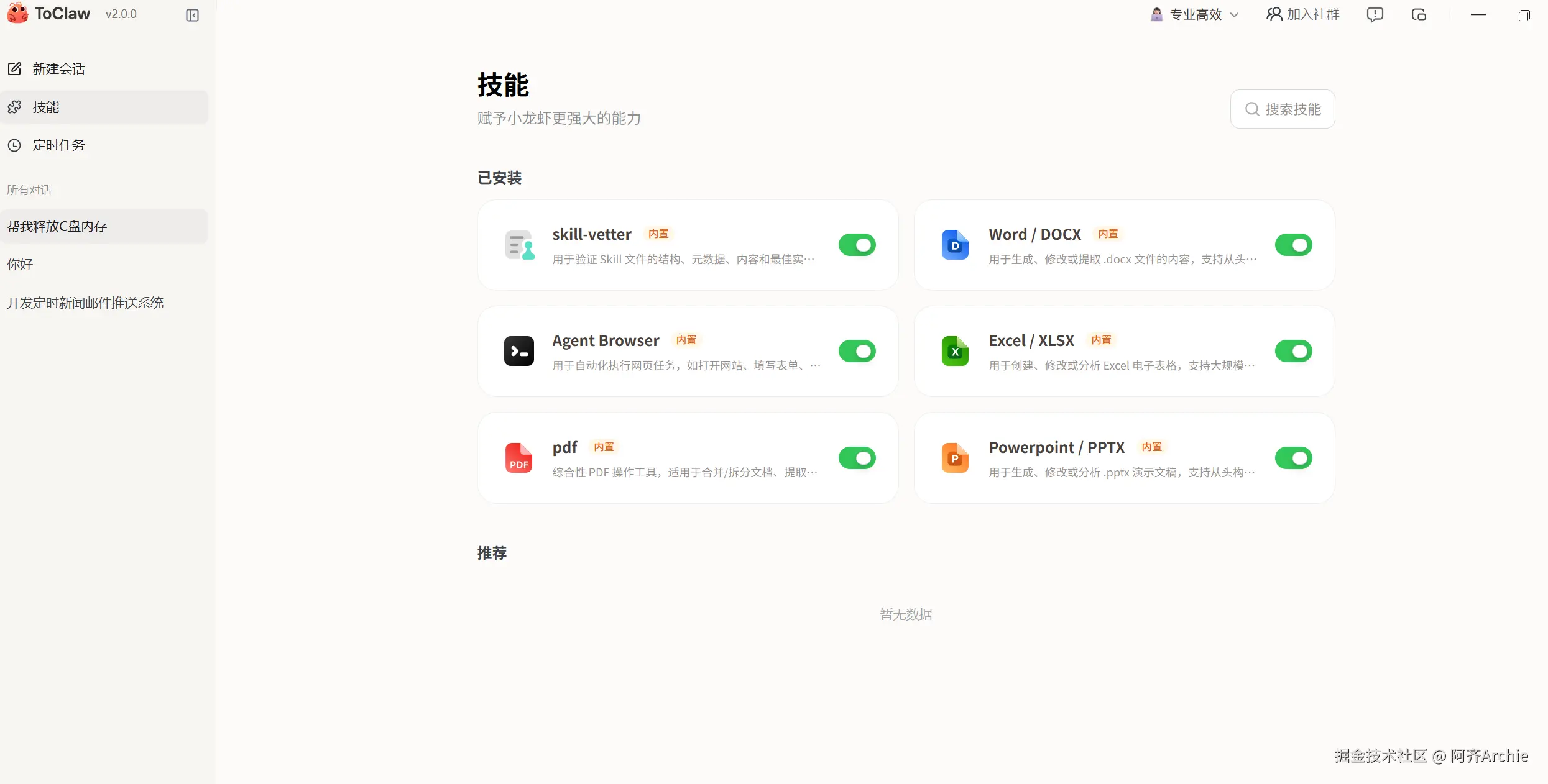 ToClaw 内置了一套开箱即用的专业技能库,覆盖了办公自动化与系统操作的核心场景,让你无需额外配置就能高效完成各类任务。