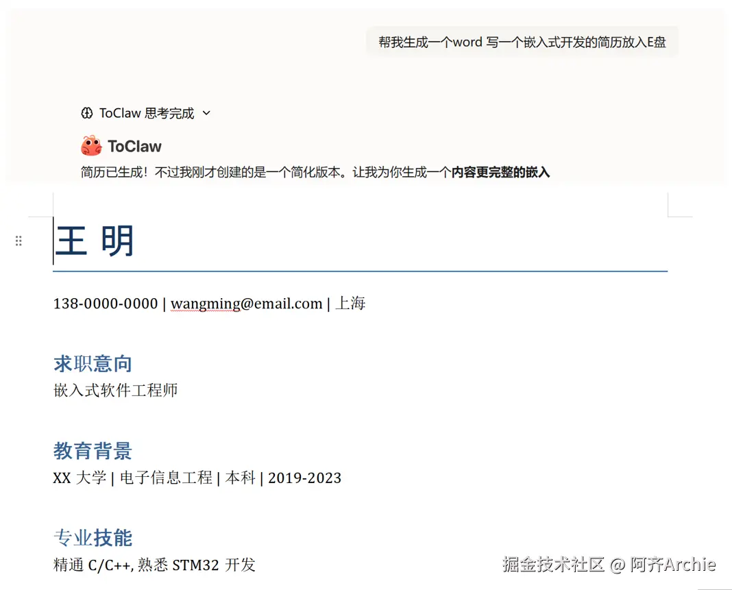 实测中,ToClaw 依托内置的 Word/DOCX 技能,展现出了极为强大的文档生成与处理能力,完全能满足开发场景的个性化需求。当你只需一句指令 “ 帮我生成一个 word 写一个嵌入式开发的简历放入 E 盘 ” ,ToClaw 会立即响应并完成创作。它不仅精准抓取了嵌入式开发岗位的核心要素,还自动构建了包含个人信息、求职意向、教育背景、专业技能的完整简历结构,甚至特别标注了 “精通 C/C++、熟悉 STM32 开发” 这类开发岗关键技能,生成内容直接可用。