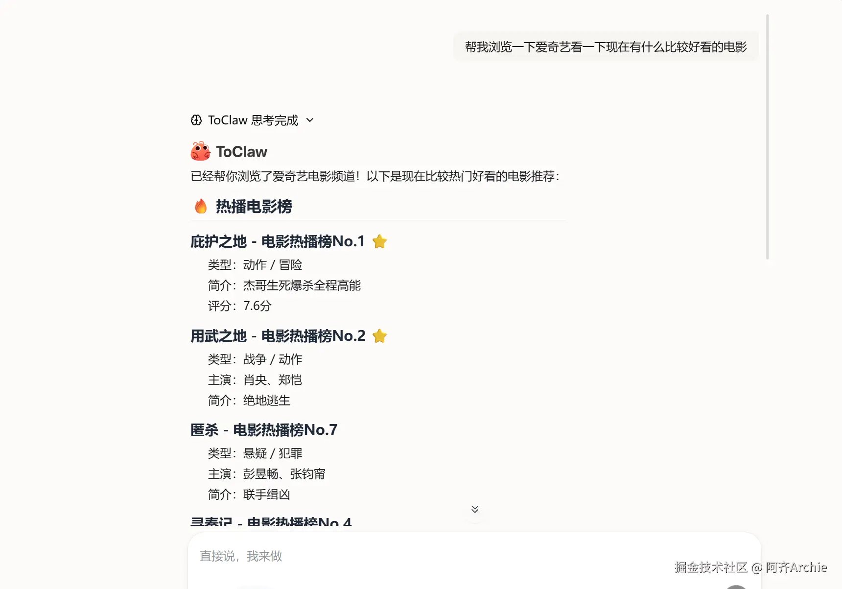 实测中,只需一句简单的指令 “帮我浏览一下爱奇艺看一下有什么比较好看的电影”,ToClaw 就能自动接管浏览器,精准访问爱奇艺电影频道。它不仅能自动遍历热门榜单,还会智能筛选出《庇护之地》《用武之地》《匿杀》等高分影片,同步清晰展示出类型、主演、评分、简介等关键信息,甚至直接帮你排好观影优先级。