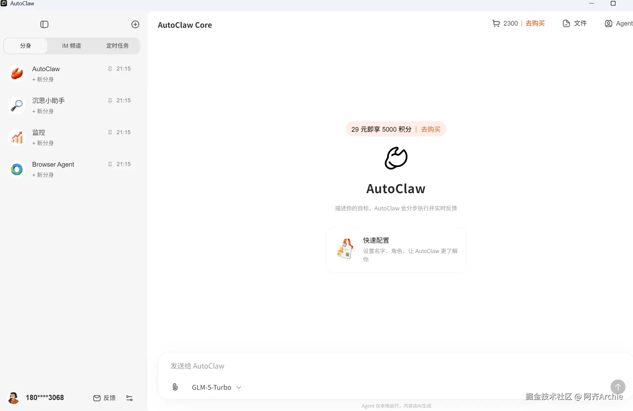 AutoClaw 相比 ToClaw 弱化了部分高阶复杂能力,去掉了 ToClaw 里那些极客向的深度自定义配置、多集群协同与复杂工作流编排功能,整体走轻量化路线。只保留了本地 AI Agent 执行、多模型接入、IM 频道联动、浏览器自动化、定时任务与基础分身这些核心实用功能,用简化的形态实现了 AI 自动化的核心需求,却少了一些高阶拓展性。