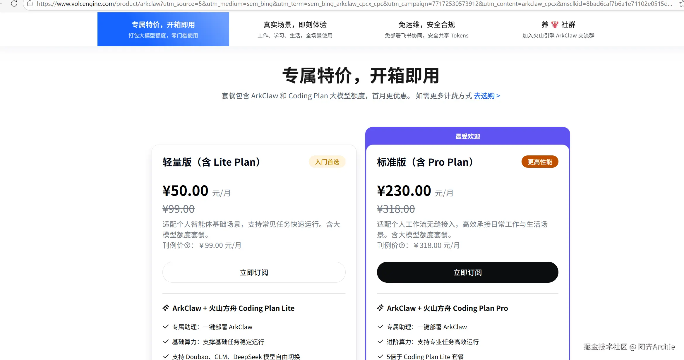 ArkClaw 作为火山引擎推出的同类产品,采用订阅付费模式,轻量版 50 元 / 月、标准版 230 元 / 月,虽然提供了专属算力与模型切换能力,但对想尝鲜的小白用户并不友好 —— 不仅需要提前付费订阅,还需完成云平台账号绑定、资源部署等额外操作,上手成本远高于 ToClaw。