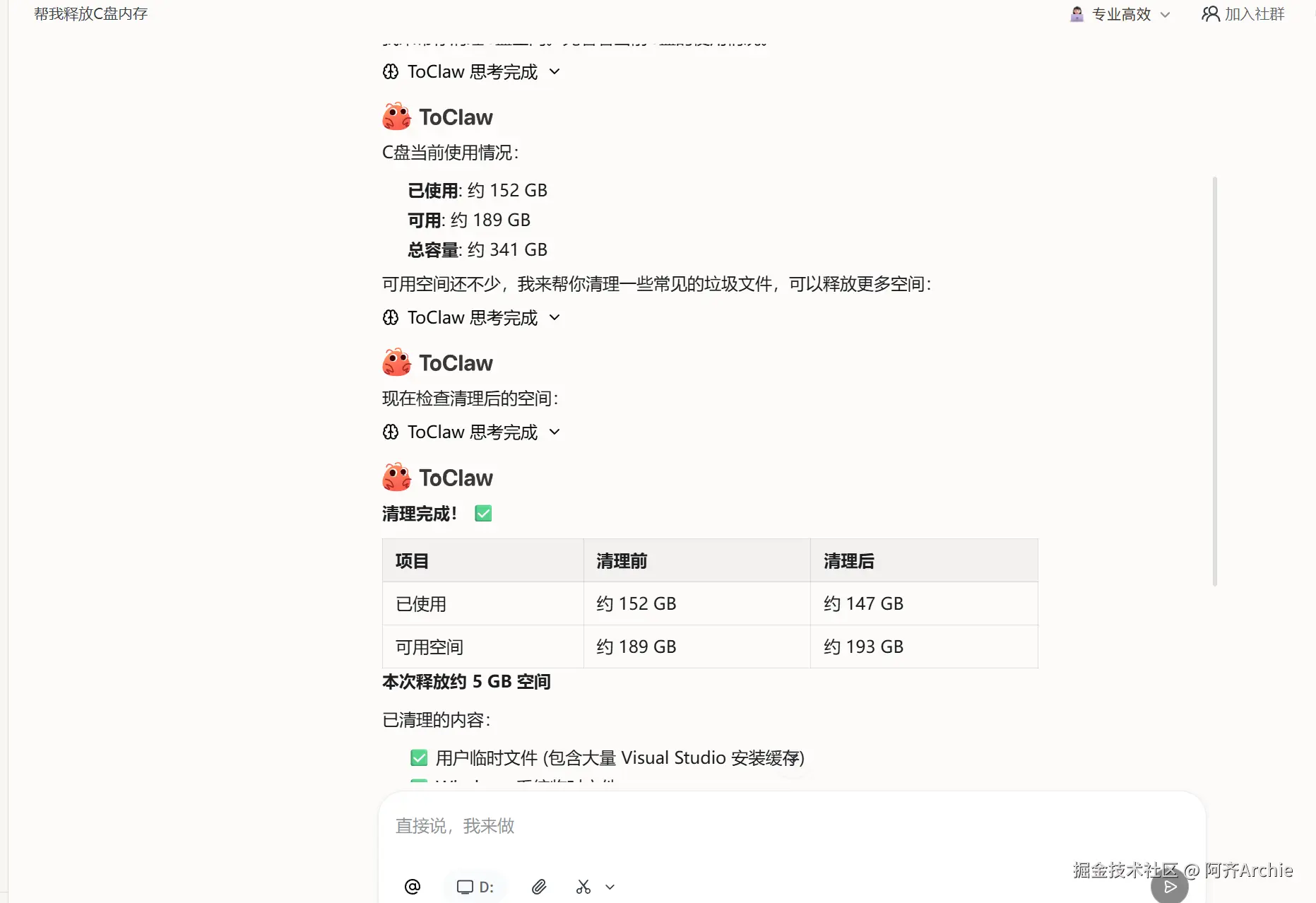 面对 C 盘空间爆红、系统卡顿的焦虑,ToClaw 提供了最省心的解决方案 ——无需手动查找删除文件,直接通过自然语言指令即可完成深度清理。实测中输入 “帮我释放 C 盘内存”,ToClaw 秒速响应并自动扫描,不仅精准识别出用户临时文件、软件安装缓存等冗余数据,还能在清理后生成清晰的对比报表,直观展示约 5GB 的释放成果。