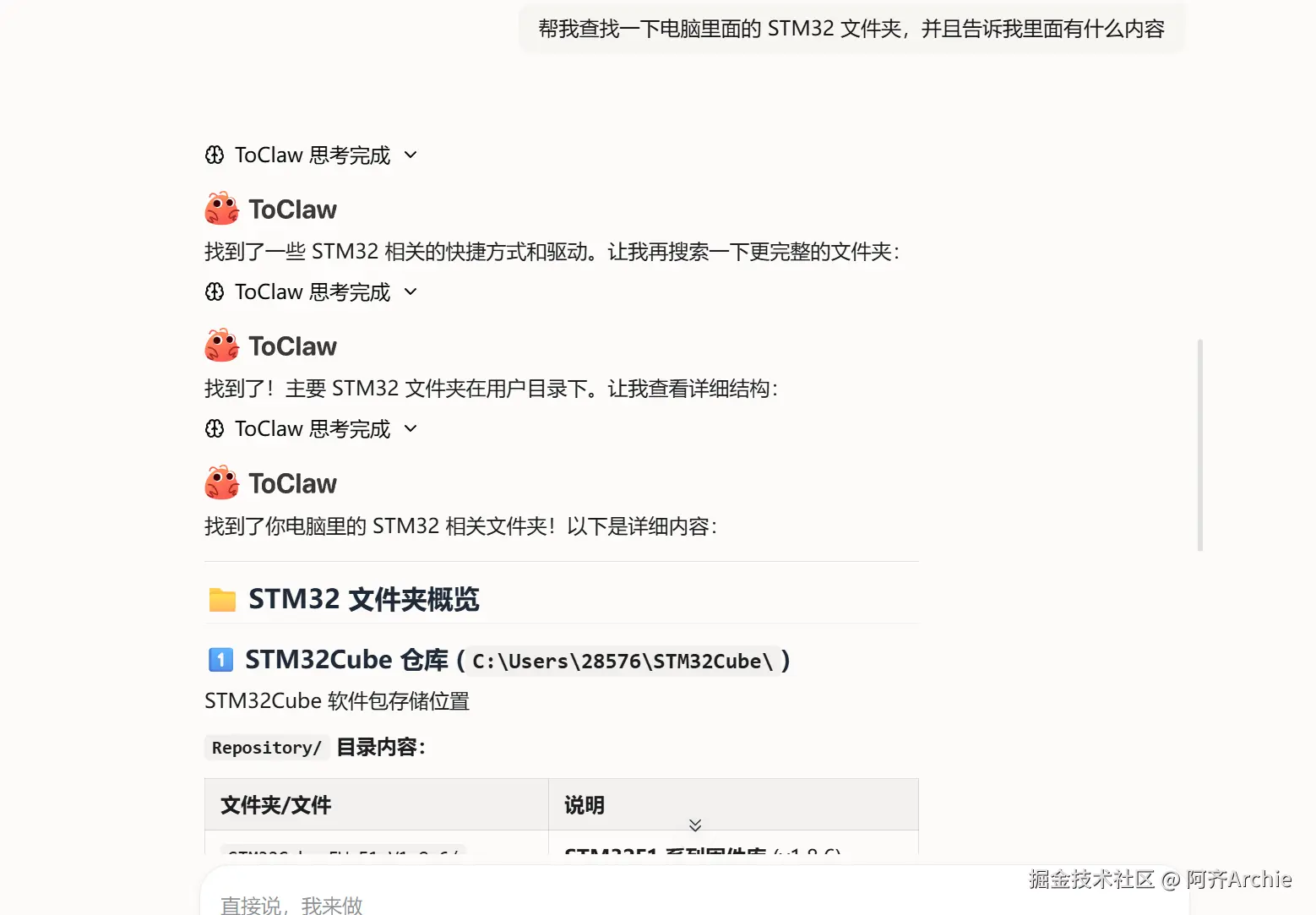 面对电脑里散落各处的开发文件,ToClaw 能帮你彻底告别 “大海捞针” 式的手动查找。只需一句自然语言指令,比如 “帮我查找一下电脑里面的 STM32 文件夹,并且告诉我里面有什么内容”,它就能自动遍历设备目录,快速定位到目标文件夹的完整路径,还会逐层解析目录结构,清晰展示每个子文件夹和文件的用途说明。