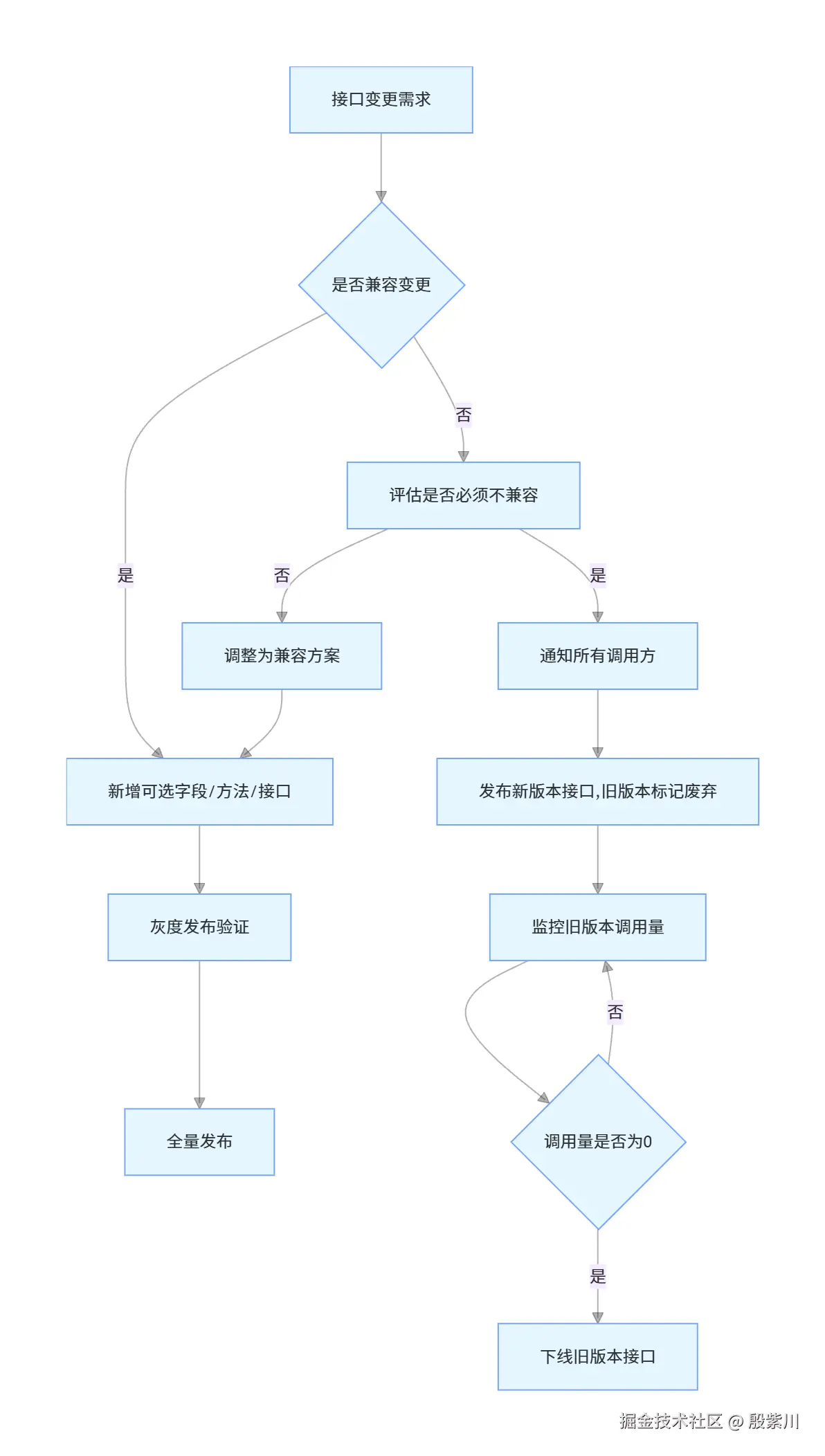 /v1/users升级为/v2/users,同时保留老版本接口,待所有调用方升级后再下线 - 接口下线:先标记废弃,明确告知调用方下线时间,预留足够的升级周期,待调用量降为0后再执行下线操作