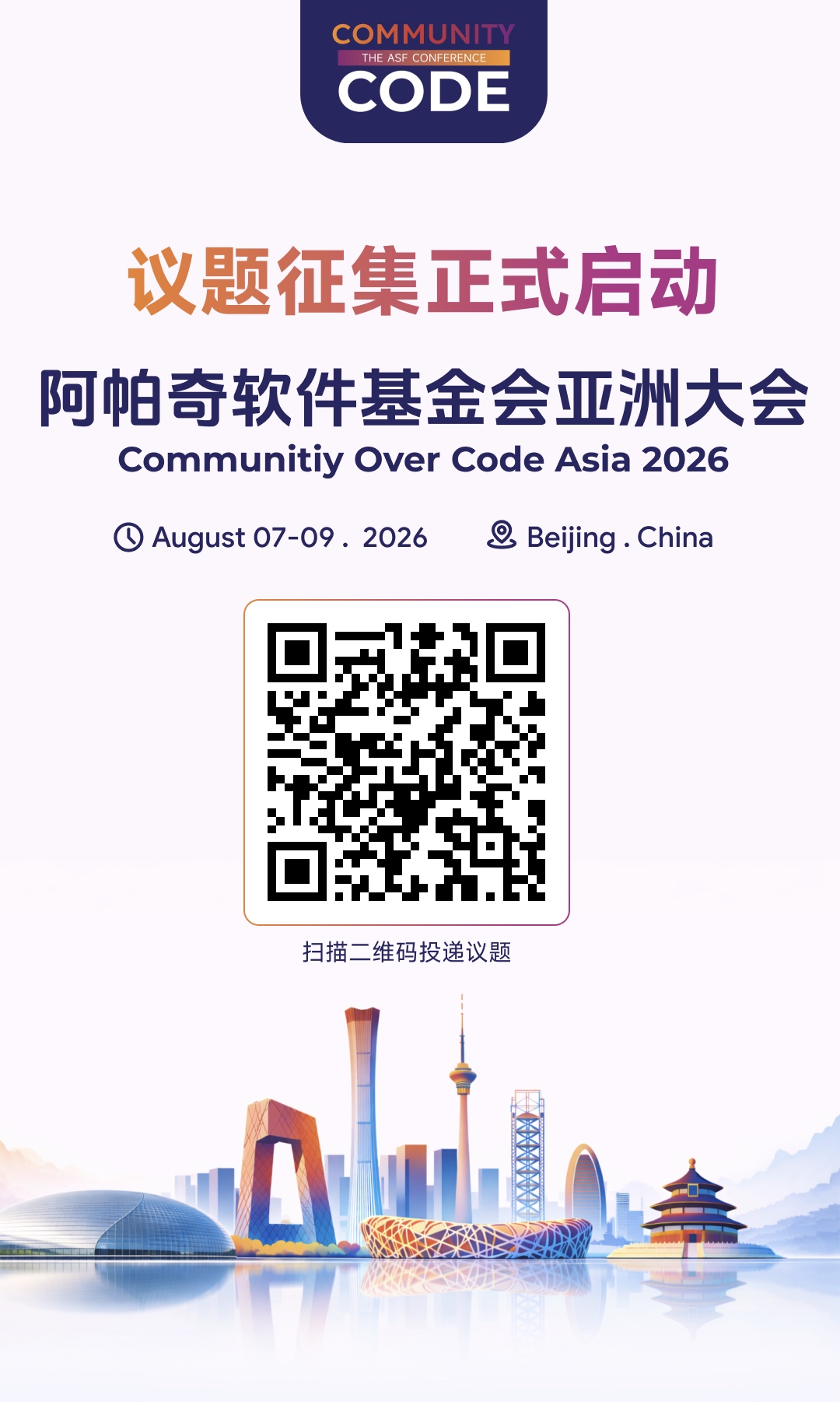 Community Over Code Asia 2026 将于今年 8 月 7 日—9 日在北京举行,大会议题征集也已全面启动。