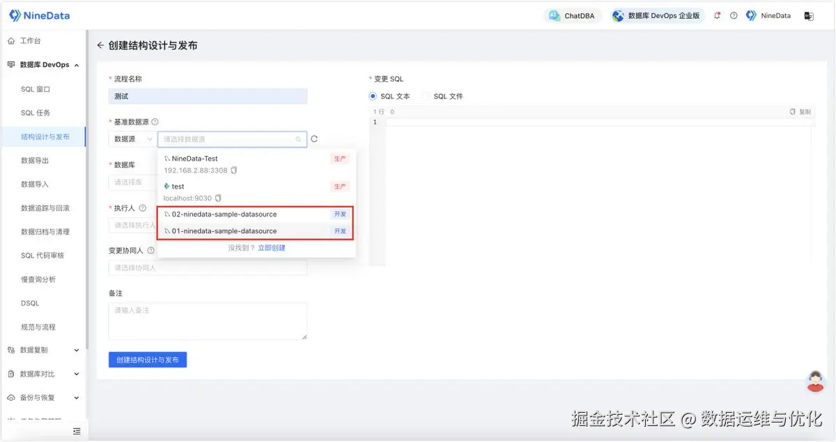 NineData 的“结构设计与发布”是围绕“基准数据源”来组织整条流程的。首节点通常对应开发环境,各类开发人员在这个基准环境中执行成功过的结构变更,会被平台按执行顺序整理成一套可追踪的 SQL 变更序列。