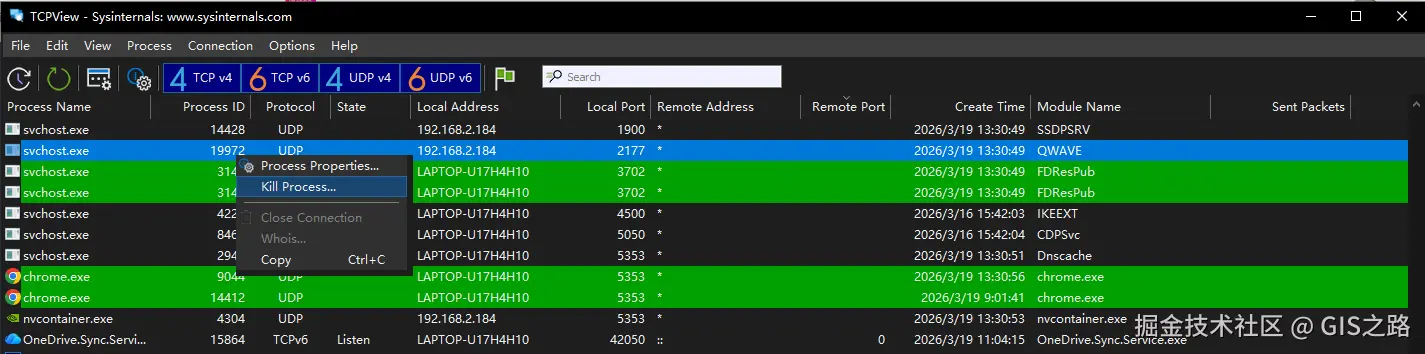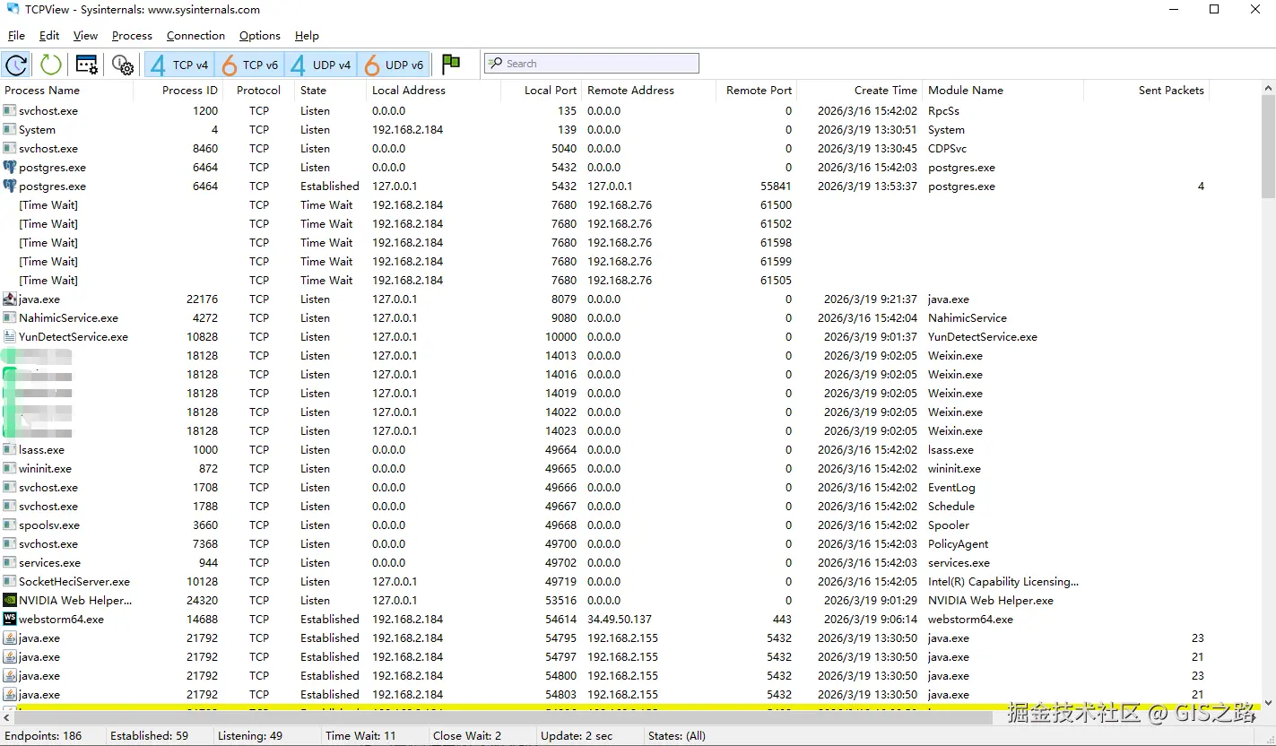 TCPView 是一个 Windows 程序,可向你显示系统上所有 TCP 和 UDP 终结点的详细列表,包括本地和远程地址以及 TCP 连接的状态。 TCPView 还会报告拥有该终结点的进程的名称。 TCPView 提供了 Windows 随附的一组信息更丰富且更便于展示的 Netstat 程序。TCPView下载包括 Tcpvcon,这是具有相同功能的命令行版本。