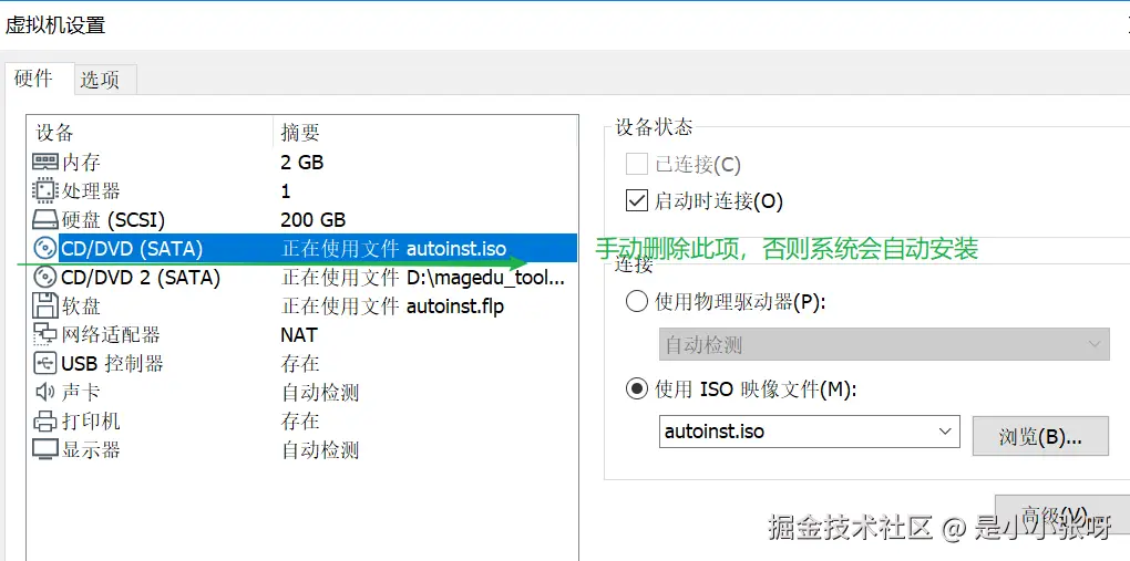 注意:如果是要手动安装系统,修改网卡名称,则要删除自动安装的光盘;不然系统会自动安装;