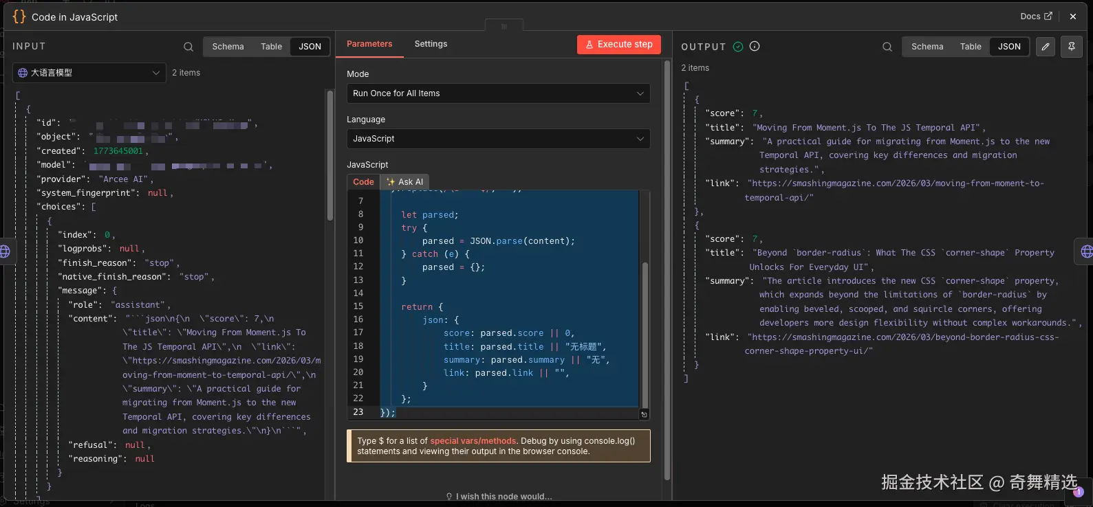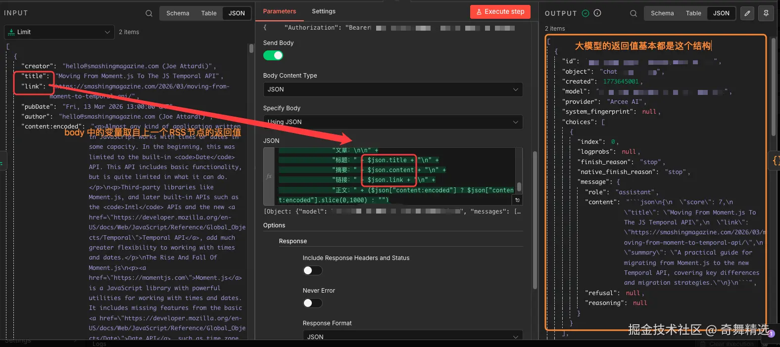 {{ { "model": "模型名称", "messages": [ { "role": "user", "content": "请根据以下文章评分。\n\n" + "评分维度:\n" + "1 信息价值\n" + "2 技术深度\n" + "3 是否值得阅读\n\n" + "返回 JSON,例如:\n" + "{\n" + " \"score\": 0,\n" + " \"title\": \"标题\"\n" + " \"link\": \"链接\"\n" + " \"summary\": \"一句话总结\"\n" + "}\n\n" + "文章:\n\n" + "标题:" + $json.title + "\n" + "摘要:" + $json.content + "\n" + "链接:" + $json.link + "\n" + "正文:" + ($json["content:encoded"] ? $json["content:encoded"].slice(0,1000) : "") } ], "reasoning": { "enabled": true } } }}- Response Format: JSON