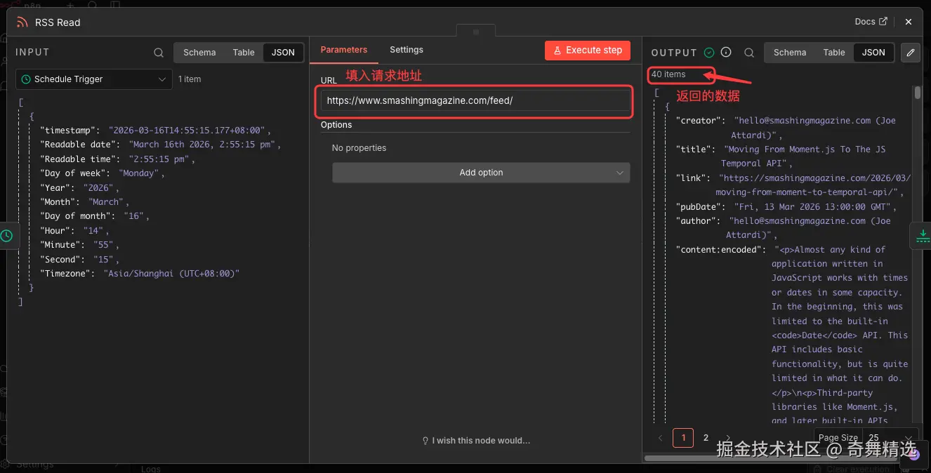 - 添加 RSS Read 节点,连接 Schedule Trigger 节点。