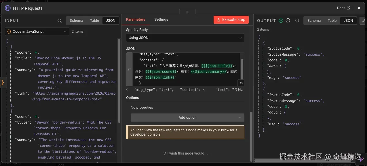 在 Code 节点配置 Language: JavaScript,把抓取到的文章整理成通用推送格式: