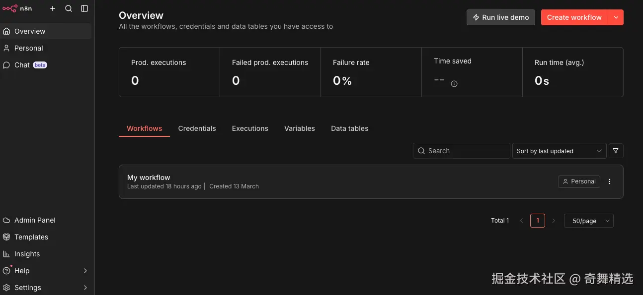 Get started for free按钮,在 Dashboard 面板点击Open instance按钮进入实例, 最后点击Create workflow按钮创建工作空间。
