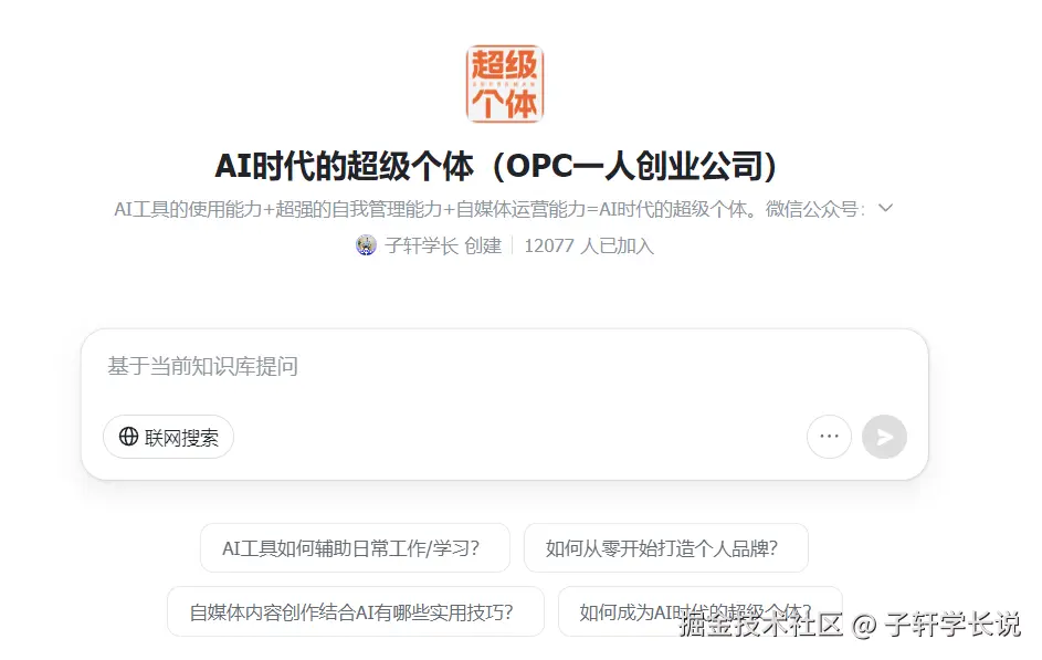 自从去年梳理清楚AI时代个人IP的体系之后,建了AI时代超级个体知识库,截止今天已经12000人加入了,说实话确实是比较意外的,大家都比较想要找到自己的新的定位,也是庆幸有这么多小伙伴的支持,才有持久的动力更新知识库,所以如果你也想在AI时代快速跟上步伐,不妨也来一起学习~