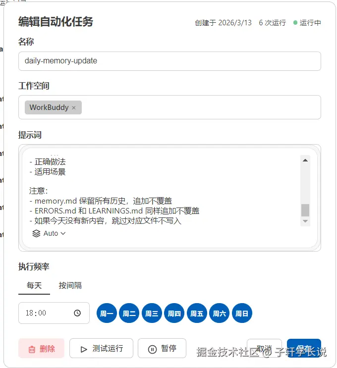 然后我还额外设定另一个每天晚上18:00让ai自动复盘一天的任务,当然现在self-improving也会自动迭代。