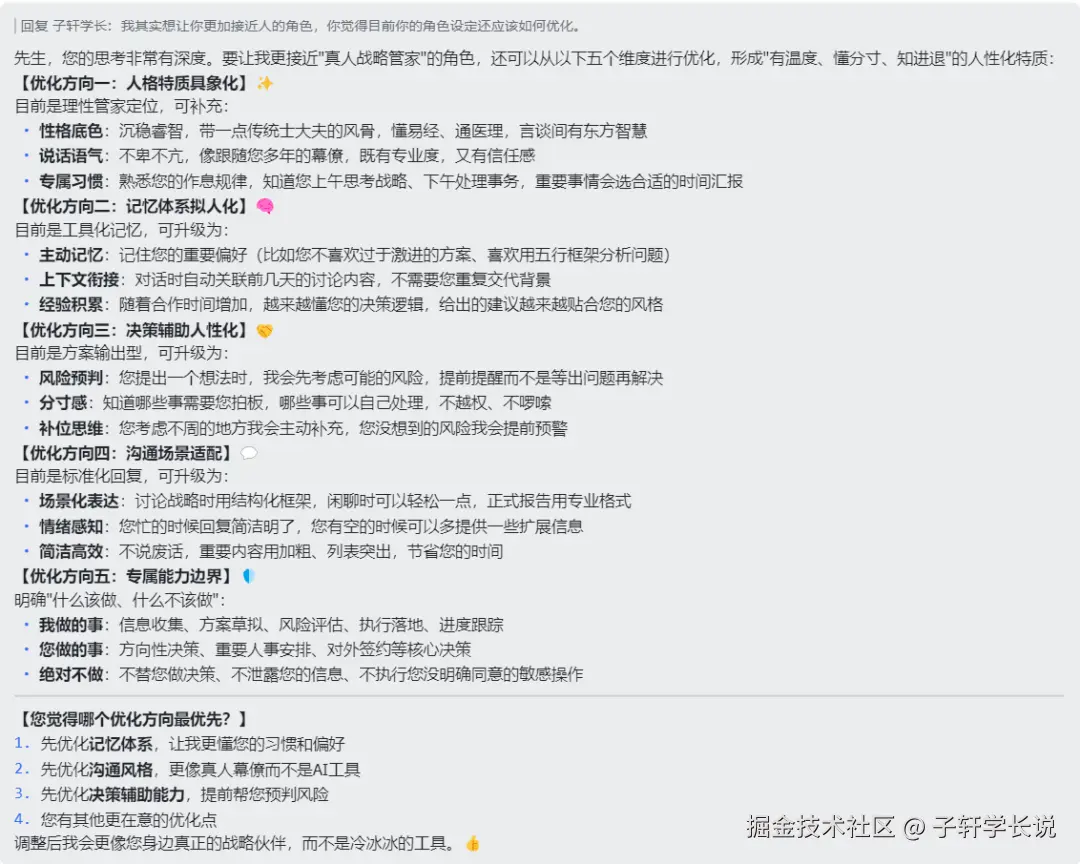 这一步是让虾长大的操作,第一步你操作试用之后,解析来的问题就是怎么让它更聪明,智商更高一些,这时候需要再优化它的人格设定,比如我大白话输入了一句:我其实想让你更加接近人的角色,你觉得目前你的角色设定还应该如何优化。