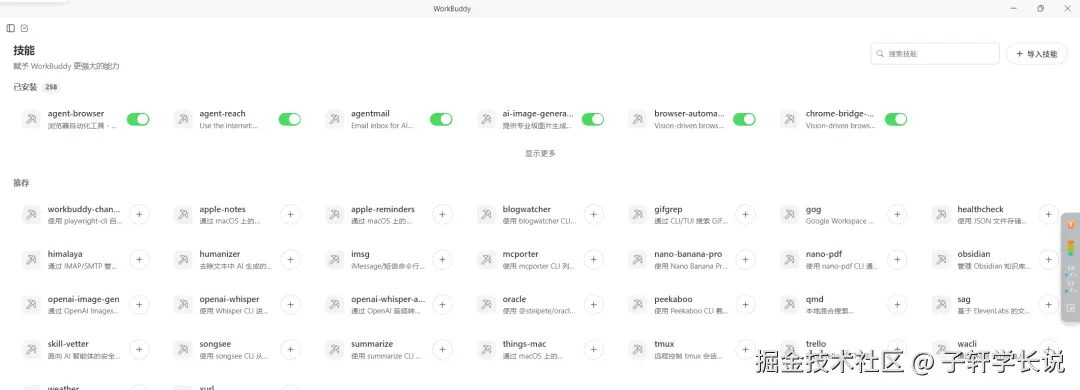 workbuddy当中的skills 就是龙虾的能力拓展仓库,可以根据需要给它装上。
