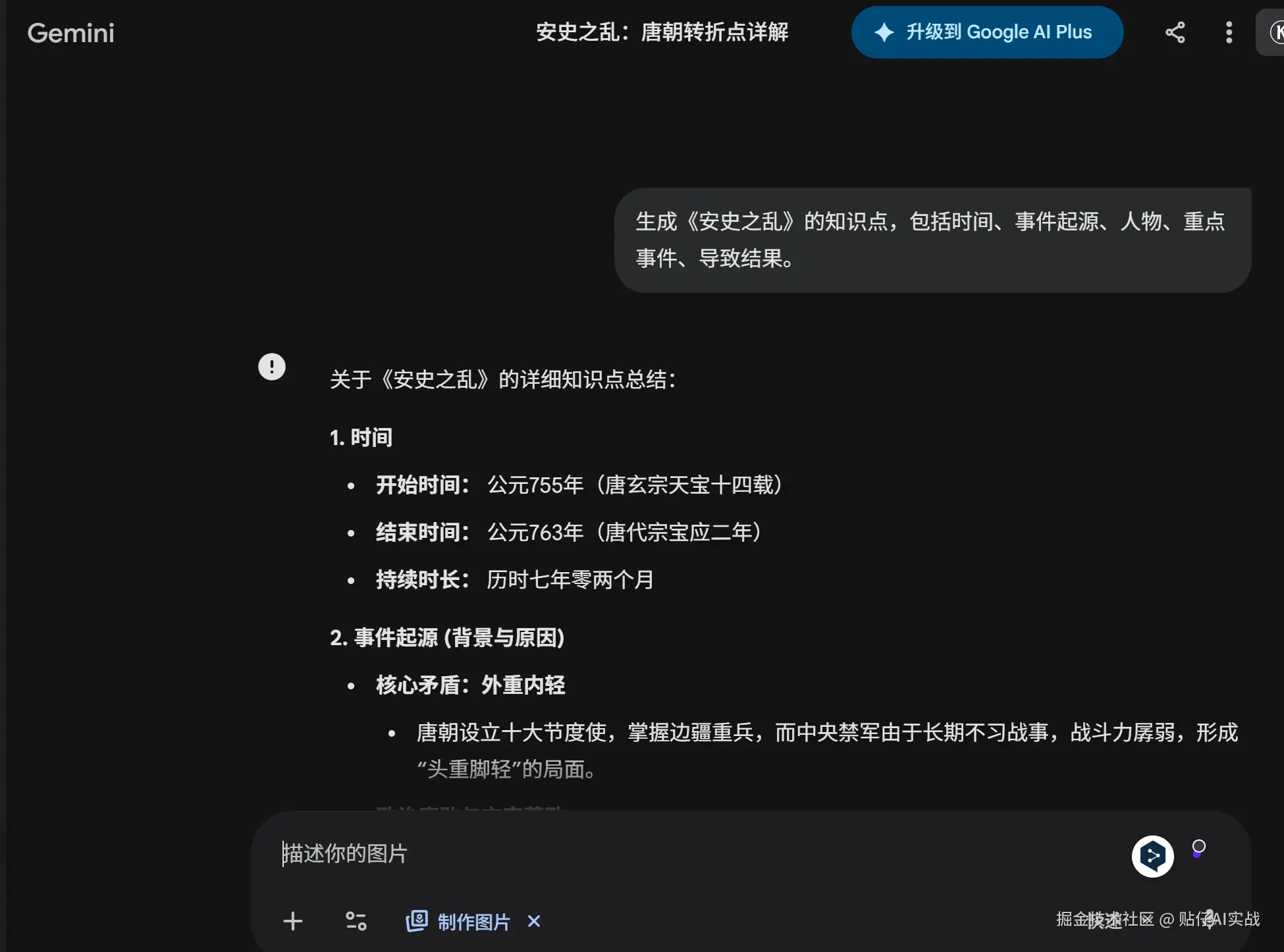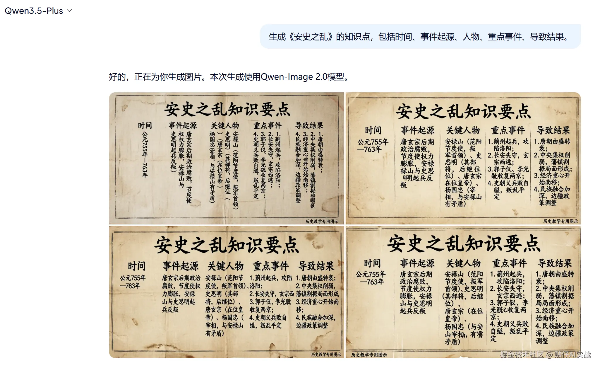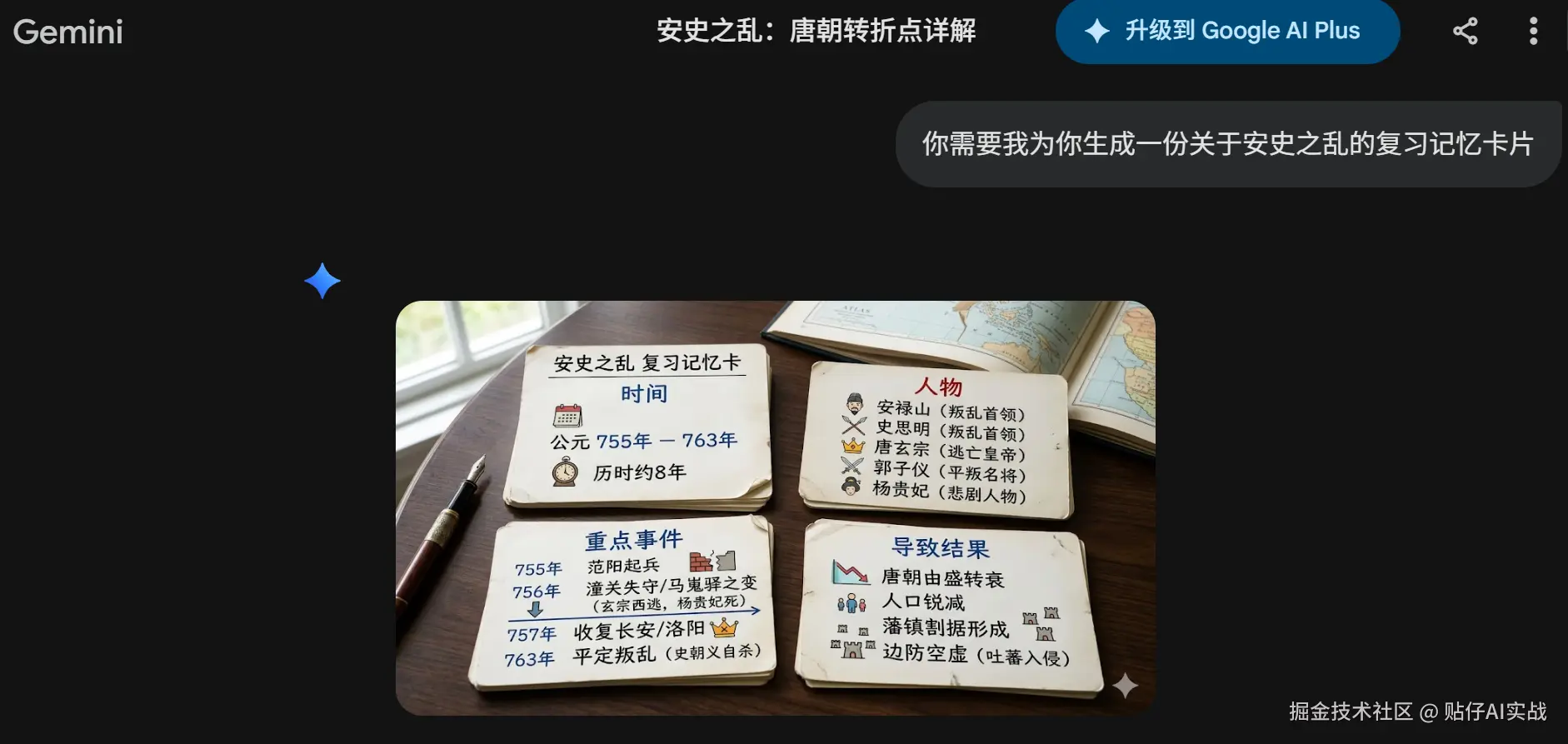 同样的提示词,gemini3先出了一个知识点的拆解内容,并未给我生成卡片图片,(即使我选了制作图片)。随后,给它明确指令:你需要我为你生成一份关于安史之乱的复习记忆卡片。终于生成了知识卡片。