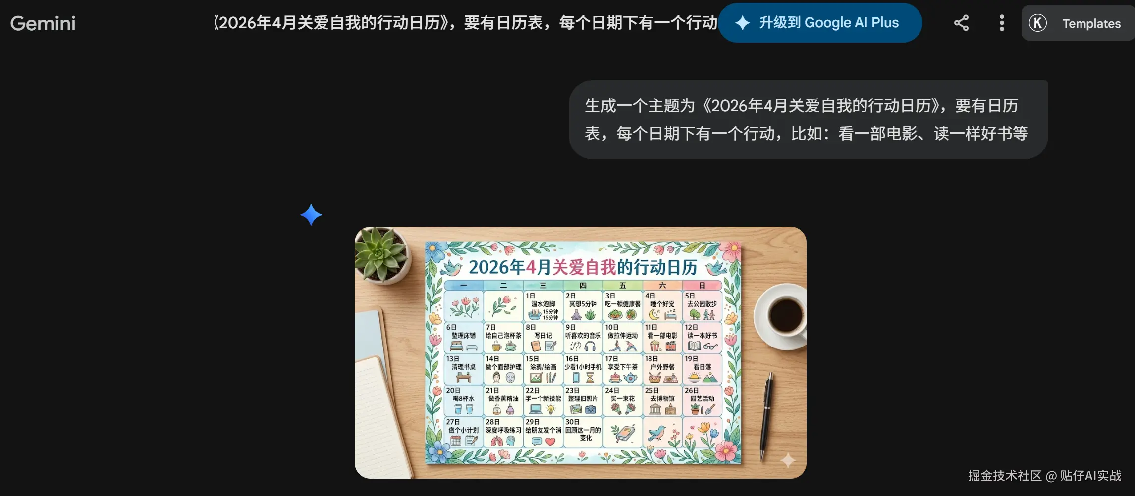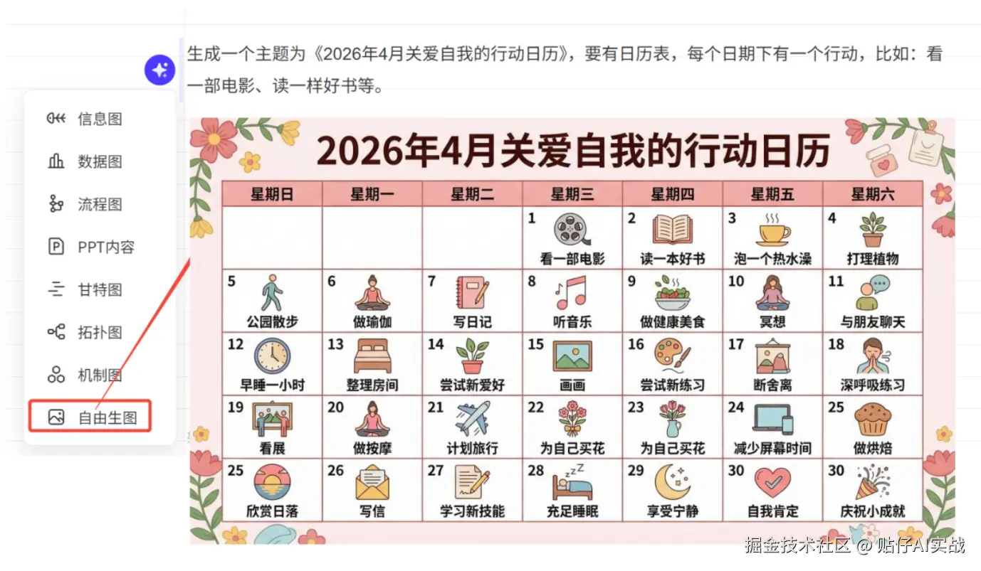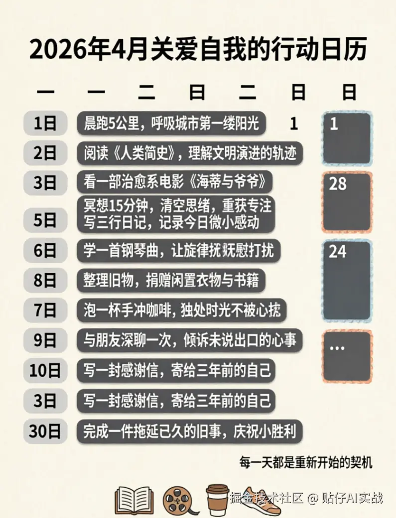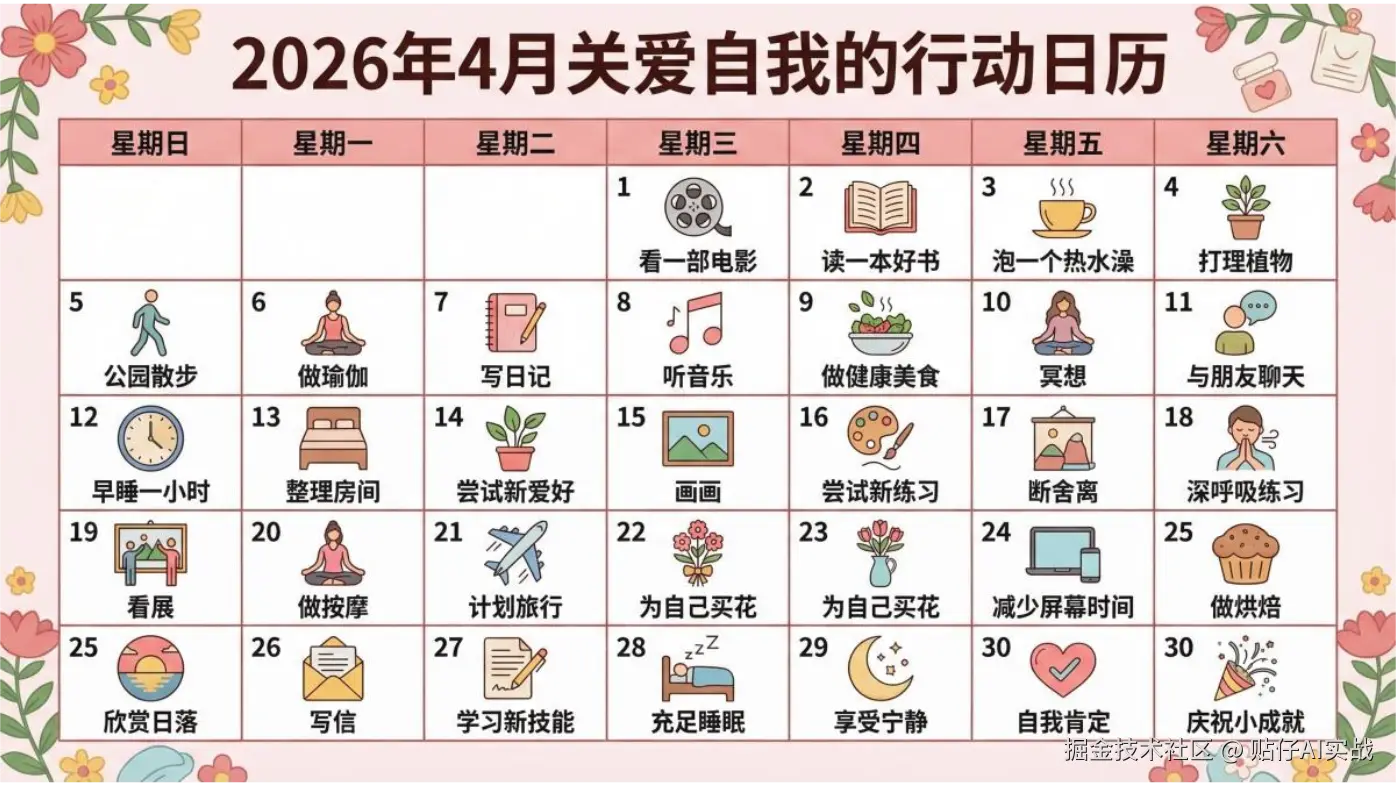 提示词: 生成一个主题为《2026年4月关爱自我的行动日历》,要有日历表,每个日期下有一个行动,比如:看一部电影、读一样好书等