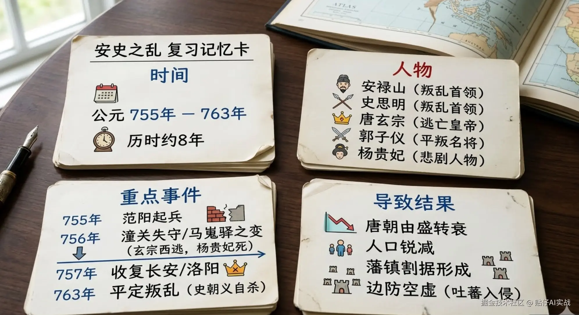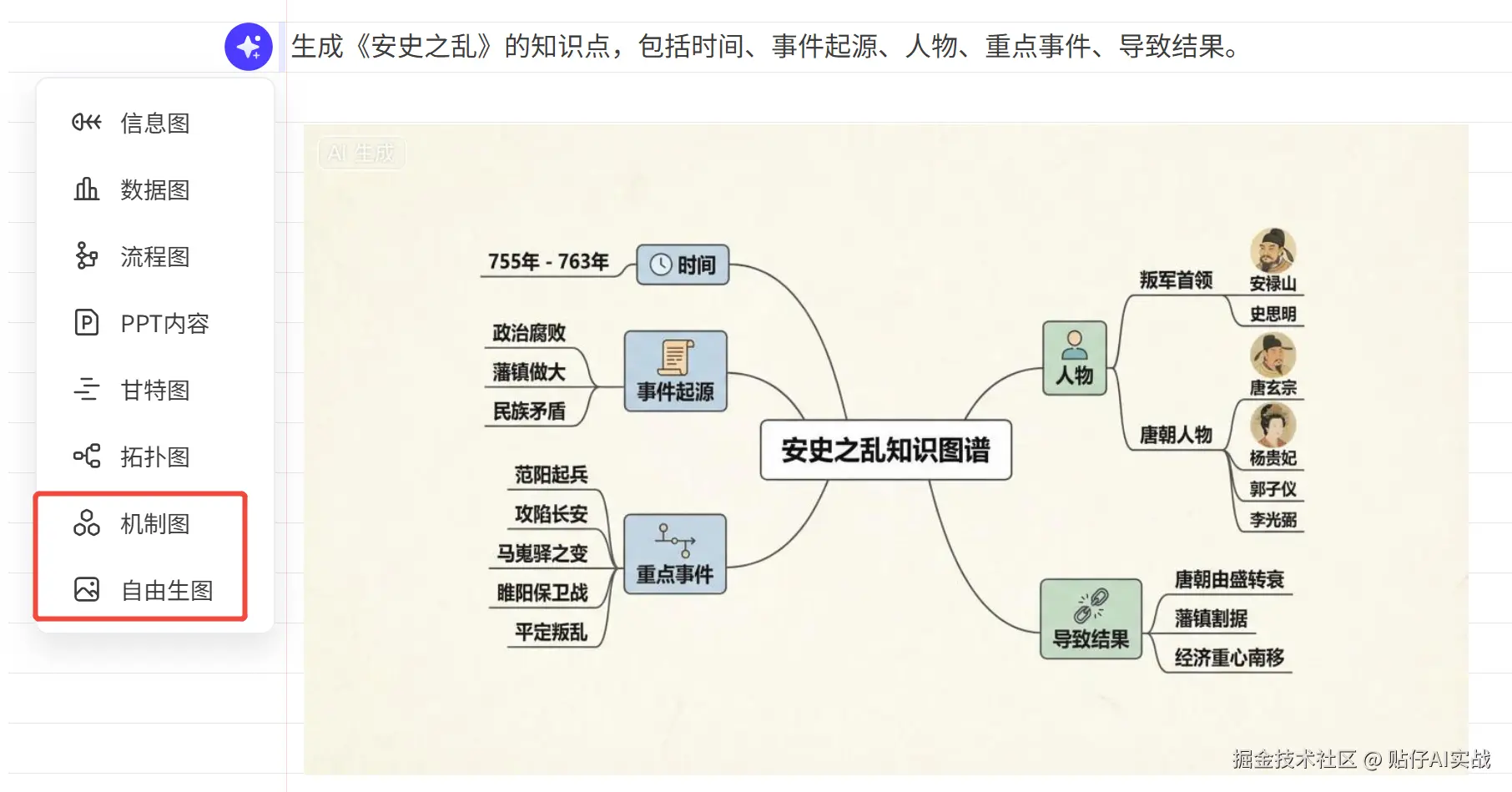 提示词: 生成《安史之乱》的知识点,包括时间、事件起源、人物、重点事件、导致结果。