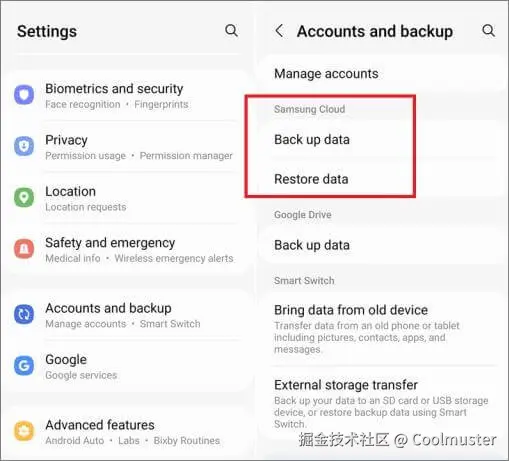 一些Android设备制造商提供自己的备份选项,例如适用于三星设备的三星云。在您的 Galaxy 设备上,打开“设置”>“帐户和备份”。在三星帐户或三星云部分下,您将看到“备份数据”和“恢复数据”选项。根据您的需要选择一项来执行三星备份和恢复。