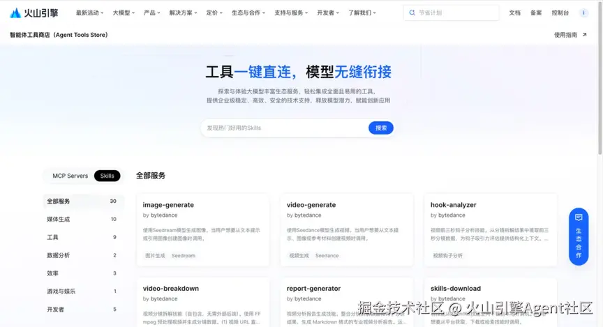 火山引擎 Skills 商店 - 众多 Skills 一键安装