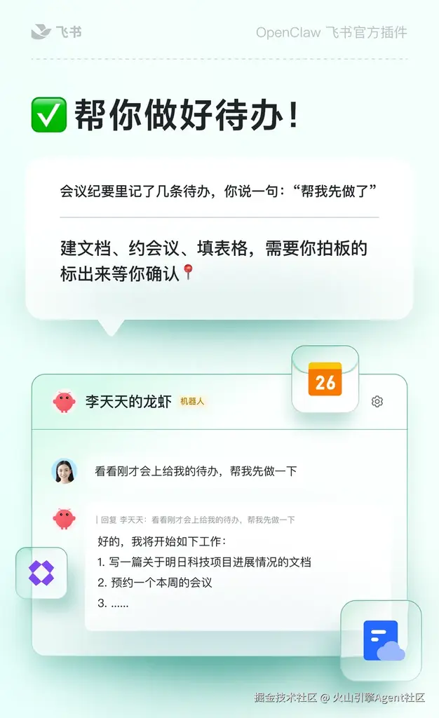新版飞书官方插件,可以让 OpenClaw 以你的身份直接操作飞书所有功能,无需反复复制粘贴内容、手动开权限,只要你说一句话,就能完成所有飞书操作。
