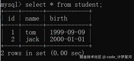 id integer unsigned primary key,name varchar(16) not null,birth date