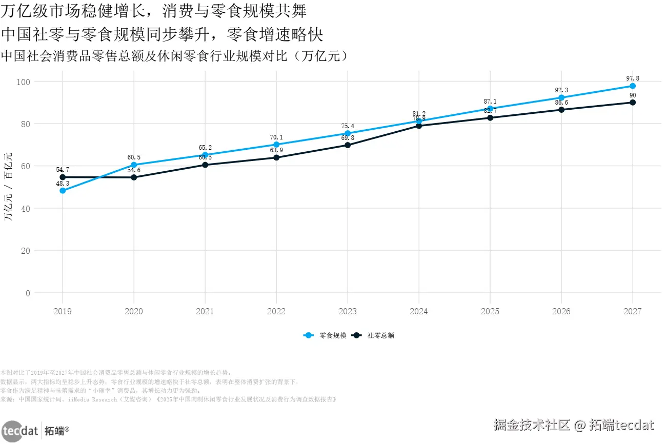 本图对比了2019-2027年中国社零总额与零食规模的增长趋势,零食增速略快于社零,表明其增长动力强劲。