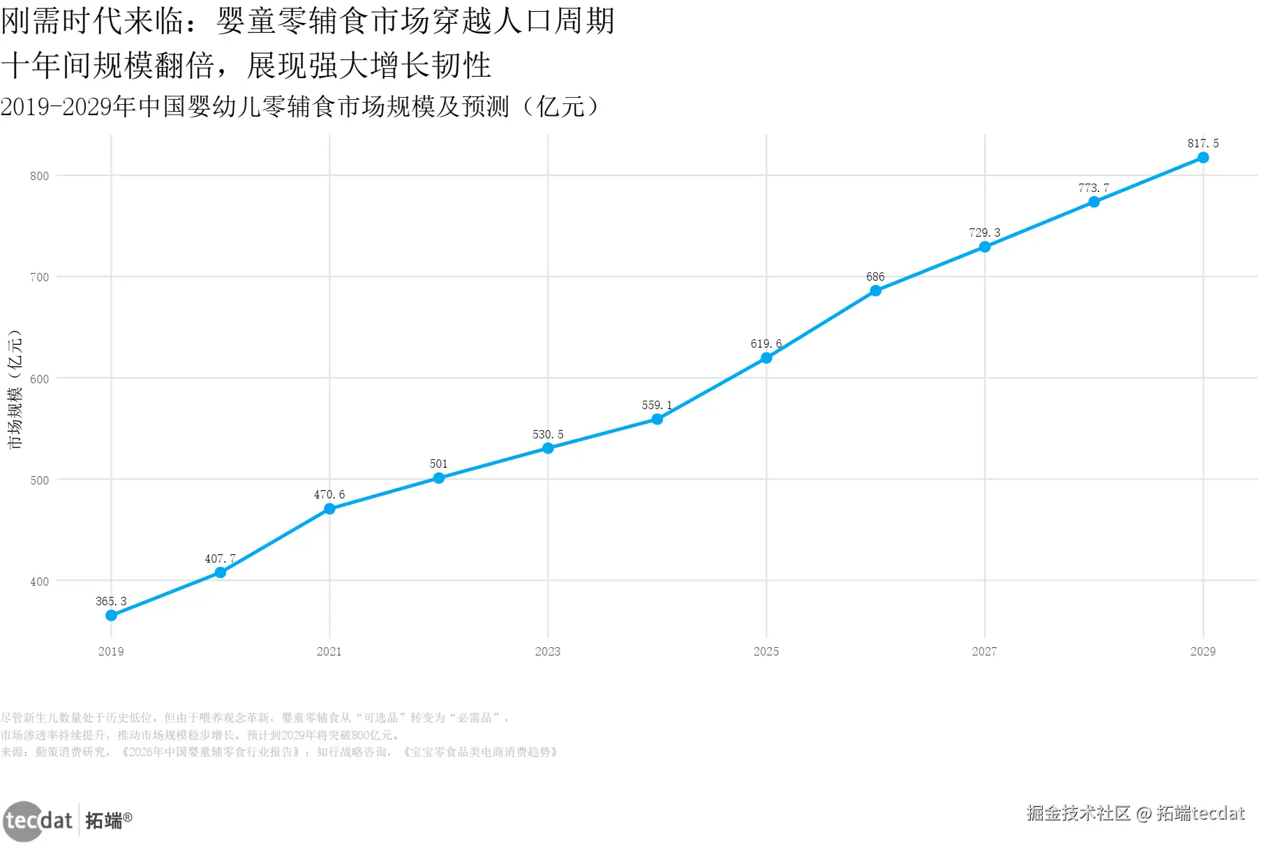 与成人零食同步扩容的,是婴童零辅食的“刚需化”进程。尽管新生儿数量走低,但喂养观念的革新推动渗透率持续提升。知行战略咨询预测,到2029年中国婴童零辅食市场规模将突破800亿元,十年间实现规模翻倍。