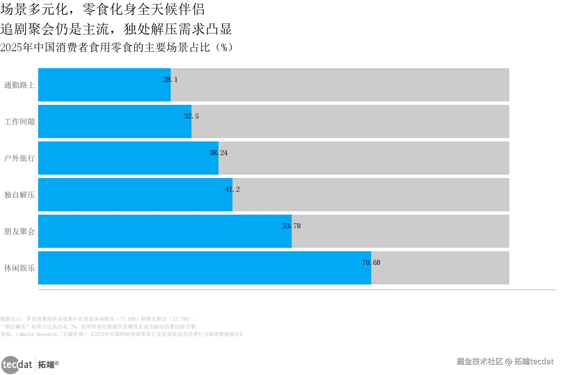 食用场景的多元化进一步印证了零食的“情绪价值”。70.68%的消费者在居家休闲时吃零食,而“独自解压”场景占比高达41.2%,说明零食已成为当代人的“情绪解药”。
