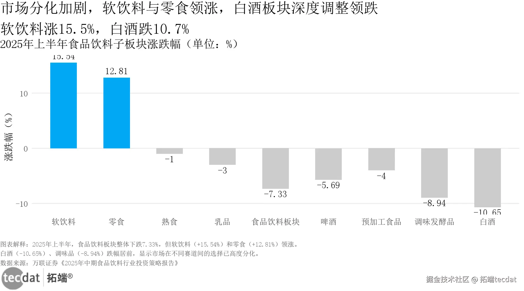研判一:2025年上半年食品饮料板块整体下跌7.33%,但软饮料(+15.54%)和零食(+12.81%)领涨,白酒(-10.65%)深度调整。