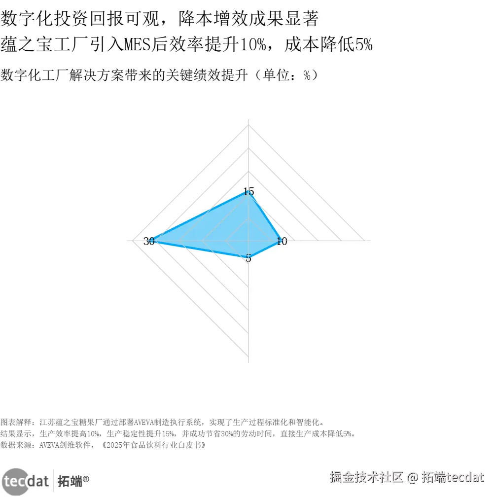 研判一:数字化投资降本增效成果显著。江苏蕴之宝糖果厂通过部署AVEVA制造执行系统,生产效率提高10%,生产稳定性提升15%,节省30%劳动时间,直接生产成本降低5%。
