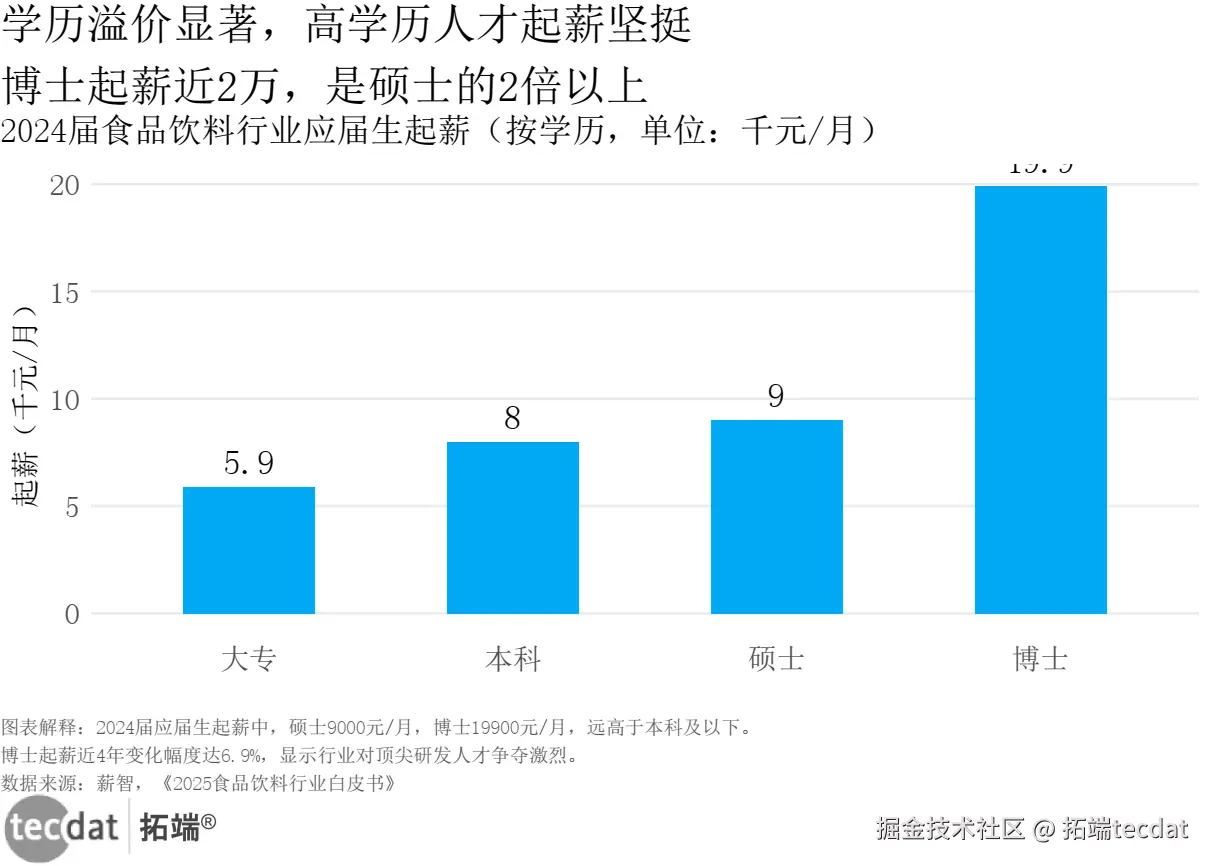 研判二:学历溢价显著,博士起薪近2万,是硕士的2倍以上。2024届应届生起薪中,硕士9000元/月,博士19900元/月,显示行业对顶尖研发人才争夺激烈。