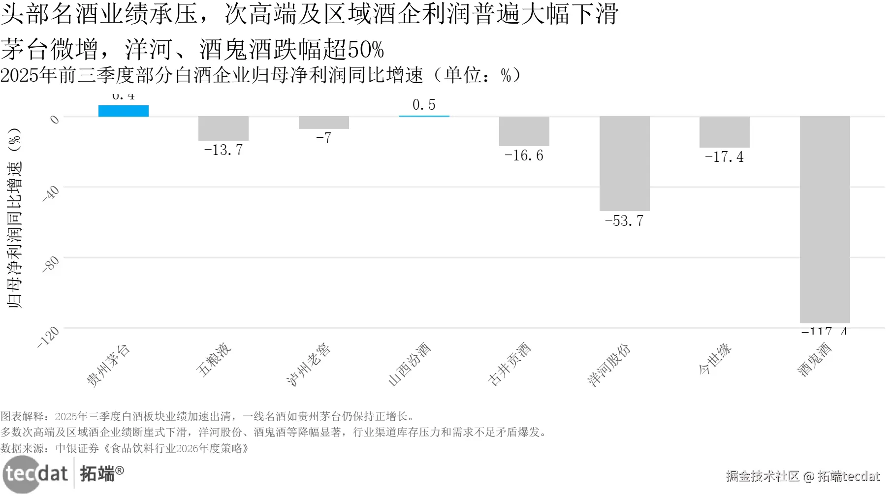 研判二:白酒企业业绩分化,茅台微增,洋河、酒鬼酒跌幅超50%,行业渠道库存压力集中爆发。