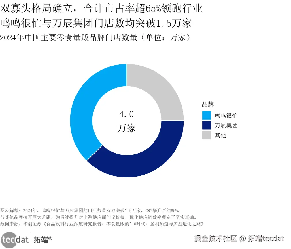 研判二:双寡头格局确立,鸣鸣很忙与万辰集团门店数均突破1.5万家,CR2约65%,为提升上游议价权奠定基础。