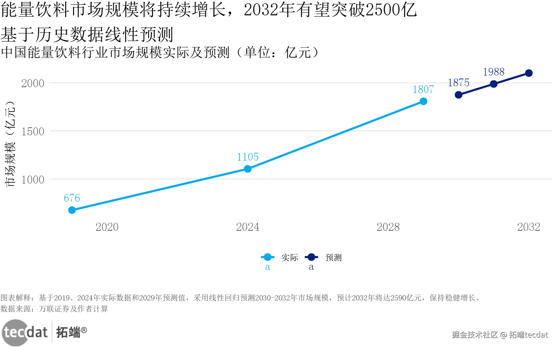 研判一:能量饮料市场持续扩容,线性 回归模型 **预测2032年有望突破2500亿元。