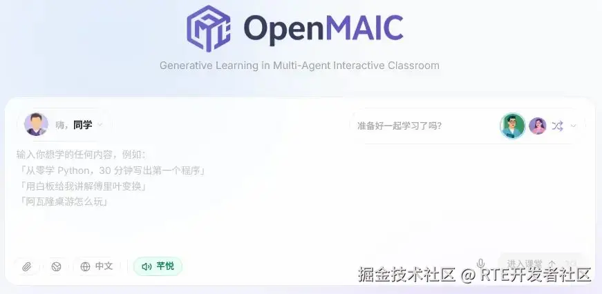 由清华开源的 OpenMAIC 平台,能把任何主题或文档转化成完整的互动课堂,包含幻灯片讲解、测验、交互模拟实验和项目制学习活动。AI 教师配合语音讲解和白板绘图,AI 同学还会主动发起讨论。
