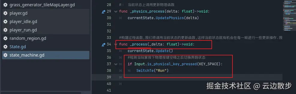 - 然后我们添加一些代码,让玩家按下空格就可以切换到奔跑状态,另外这里笔者有一个小问题失误就是这个函数名字敲错了,应该是_process而不是_physics,这里需要进行修改