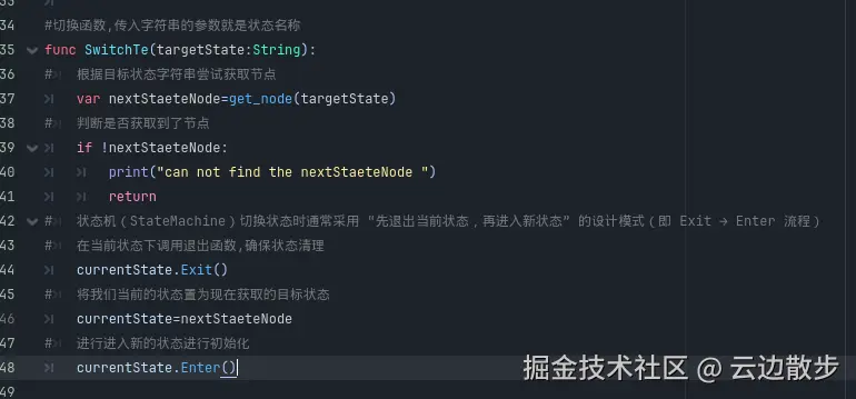 - 先进行传入参数目标状态的名称进行切换,然后获取这个节点,另外进行判断这个节点是否获取到了,获取到了之后进行退出当前状态进行清理,然后将当前状态赋值为新的状态,然后进入这个新的状态