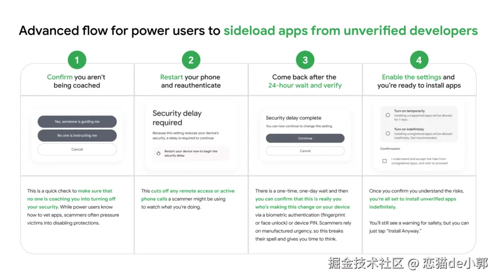 这就是全新的开发者流程,或者说没有验证账户的开发者流程,这也是 Google 说的,侧载没有消失,但场景在发生变化,整个成本和权限都在收紧,目前官方也表示,对于推出用户验证功能还是相当谨慎,一些细节还不明确,另外验证流程可能因国家/地区而异。