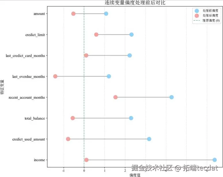 偏度图则显示,处理后变量偏度基本落在(-1,1)区间,接近对称分布,消除了原始偏态对模型的影响。