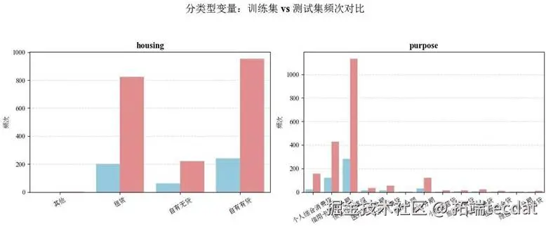 housing、purpose。housing类别少,使用独热编码;purpose多达13类,为避免维度灾难,采用目标编码。