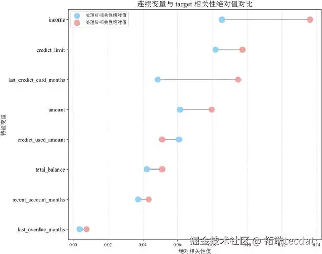 可以看到,处理后大部分特征与target的相关性有所提升,其中 income、last_credit_card_months 变化尤为明显。