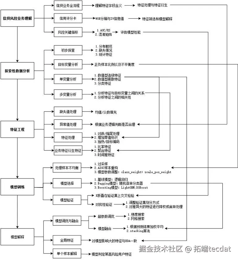 我们的团队曾协助客户上线新产品,面对仅500条训练样本、违约率仅2%的脱敏数据集,我们没有盲目堆砌复杂模型,而是从业务理解出发,通过结构化特征工程与审慎的模型选择,最终构建出一个高召回、高鲁棒且易于解释的逻辑回归模型。本文完整还原这一过程,希望能为同行提供借鉴。整体思路可概括为下图: