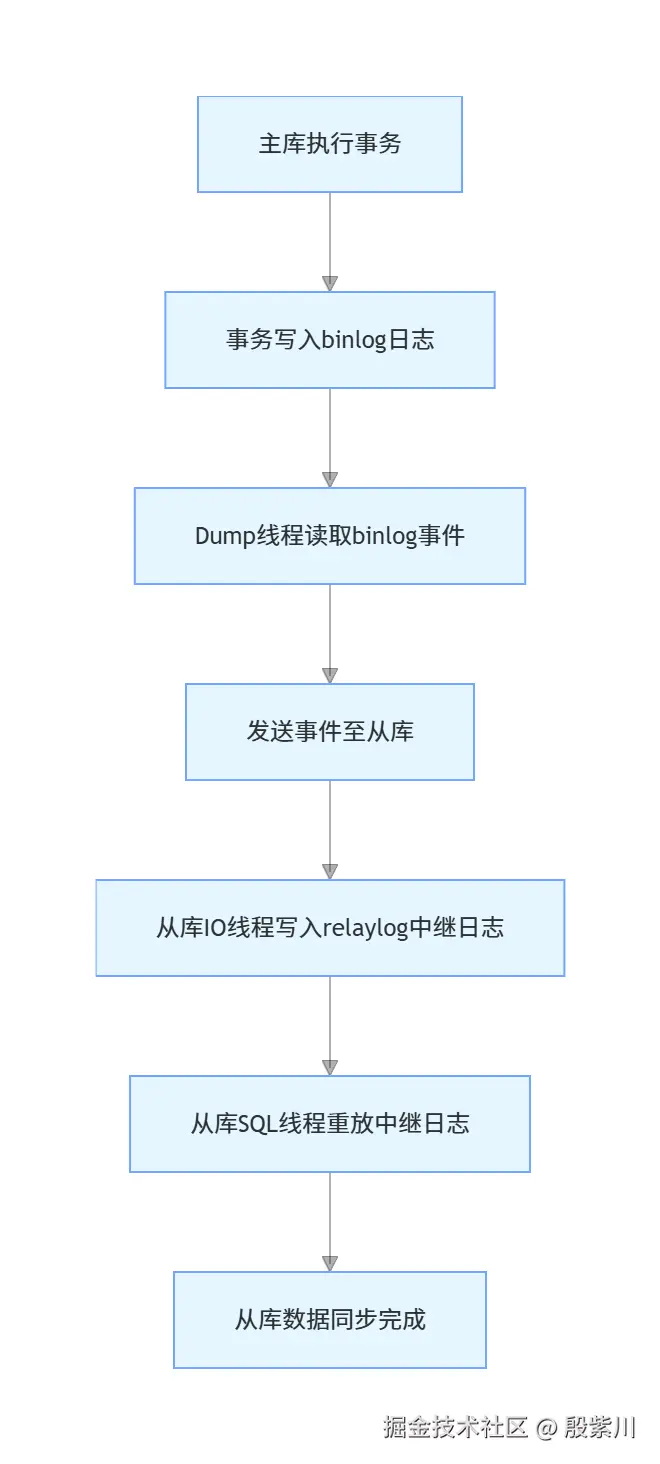 ROW行级格式,记录每一行数据的修改前后状态,彻底避免主从不一致问题。 - Dump线程:主库上的后台线程,当从库建立连接后,读取binlog日志并发送给从库,每个从库对应一个独立的Dump线程。