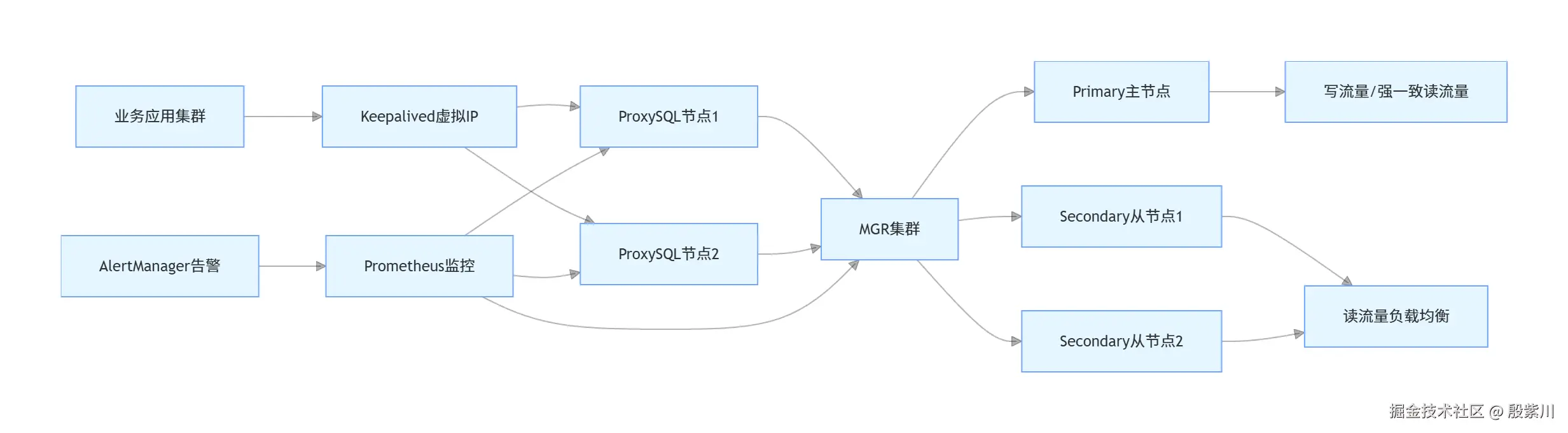 生产环境最优的高可用架构为:MGR单主集群 + ProxySQL读写分离 + 全链路监控告警,架构图如下: