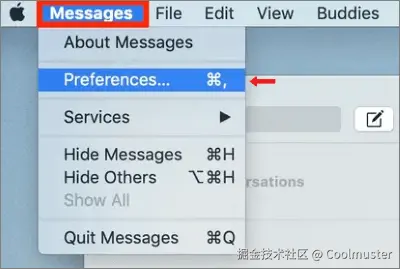 步骤3:单击顶部菜单中的“消息”,然后选择“首选项”。
